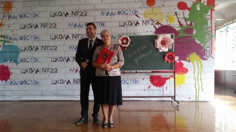 Депутат Законодательного собрания Самсонов Артём Анатольевич в торжественной обстановке вручил Краевой Т. И. заслуженную награду. Надо сказать, что депутат Самсонов А. А. всегда откликается на ходатайства о награждении Владивостокской профорганизации образования.